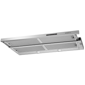 The telescopic hood is concealed beneath a wall cabinet, exhibiting no discernible external indications of its operational attributes. The controls of the device are discreetly positioned behind a modest stainless steel front panel, and may be easily accessed by drawing the panel towards oneself.